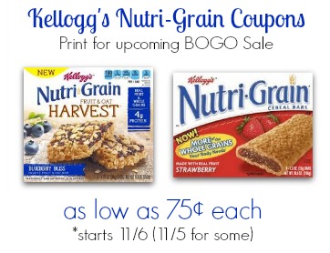 Here are a couple of Kellogg’s Nutri-Grain bar coupons you might want to grab. The $1/1 coupon just popped up this morning. These will be BOGO in our new weekly ad that begins tomorrow 11/6 (today 11/5 for some). The Nutri-Grain Fruit & Oat Harvest bars ARE included in the BOGO sale. Both of these coupons should come up clipped for you right away through the links below.